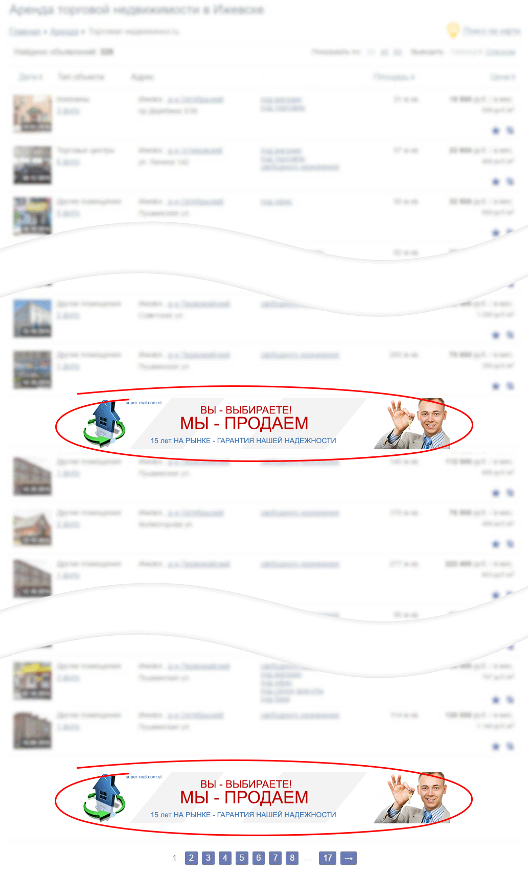 - Баннер отображается во всех списках объявлений (разделы «Аренда», «Продажа», подборки объявлений, поиск).